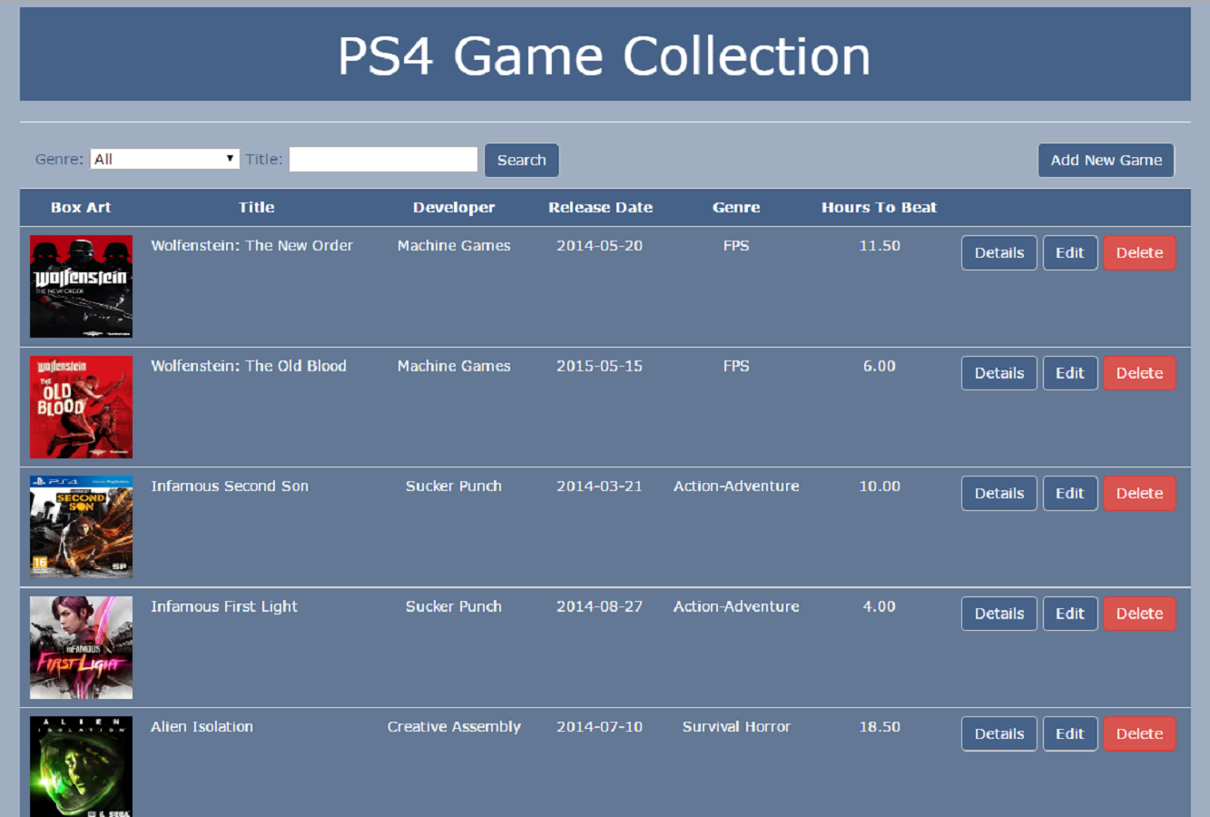 This application allows users to manage and maintain a database of their gaming collection. Users can interact with the database in multiple ways by adding, editing and deleting information as necessary. The enteries could be filtered by genre and each entry has its own details page.
